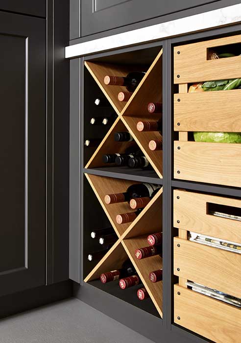 Rückwände aus Holz eignen sich besonders gut, um Wärme zu erzeugen. Eine dunkle Rückwand bildet eine schöne Einheit mit dem Rest der Küche, sollte dann allerdings mit anderen Elementen kombiniert werden.