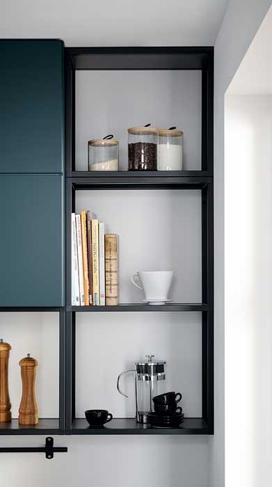 Aber auch zwei verschiedene Töne, schwarze Akzente und Naturholz eignen sich hervorragend zur Gestaltung einer blauen Küche.