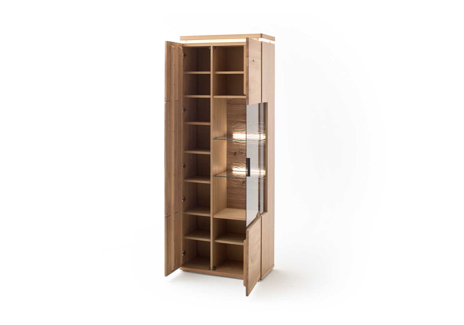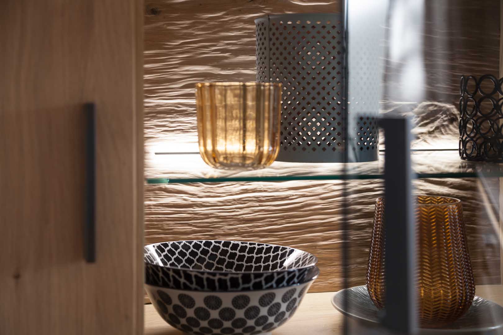 Damit der Auftritt dieser Balkeneichen Vitrine noch besser untermalt wird können Sie auf Wunsch eine Oberboden-Beleuchtung mit langlebigen LEDs für eine gemütliche Atmosphäre hinzufügen.