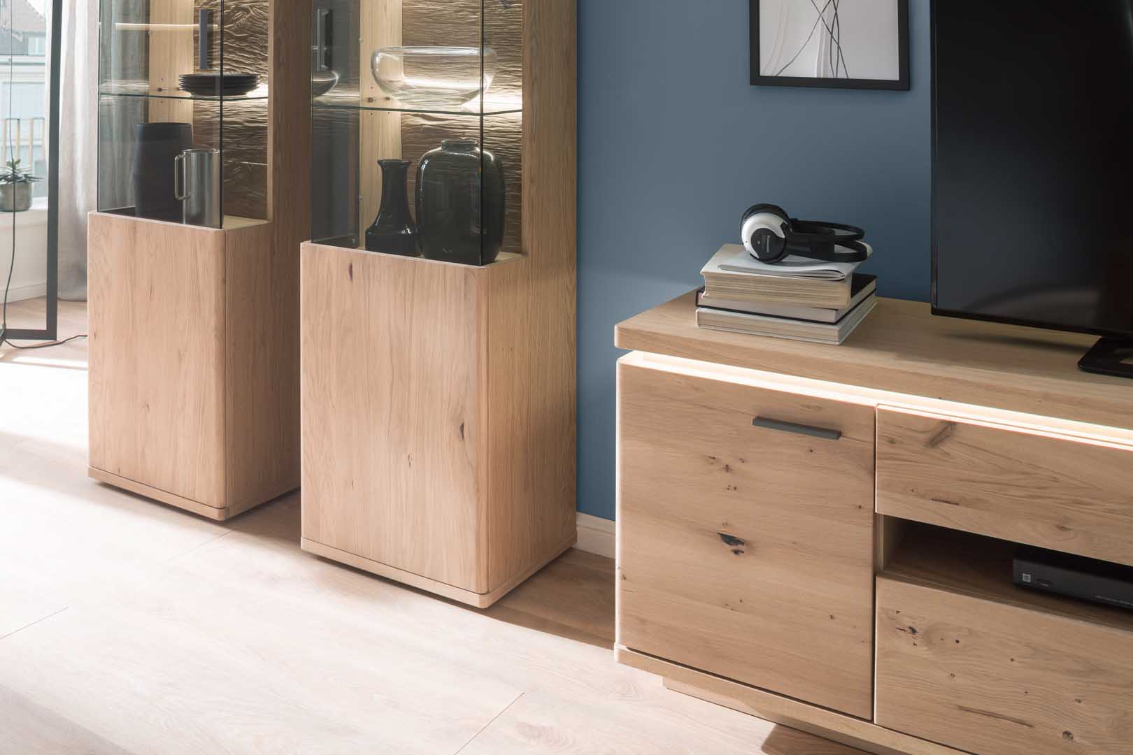 Die Kombi-Vitrine wird von einer Leichtigkeit umhüllt, die sich aus dem schicken Glaseinsatz der rechten Vitrinentüre ergibt.
