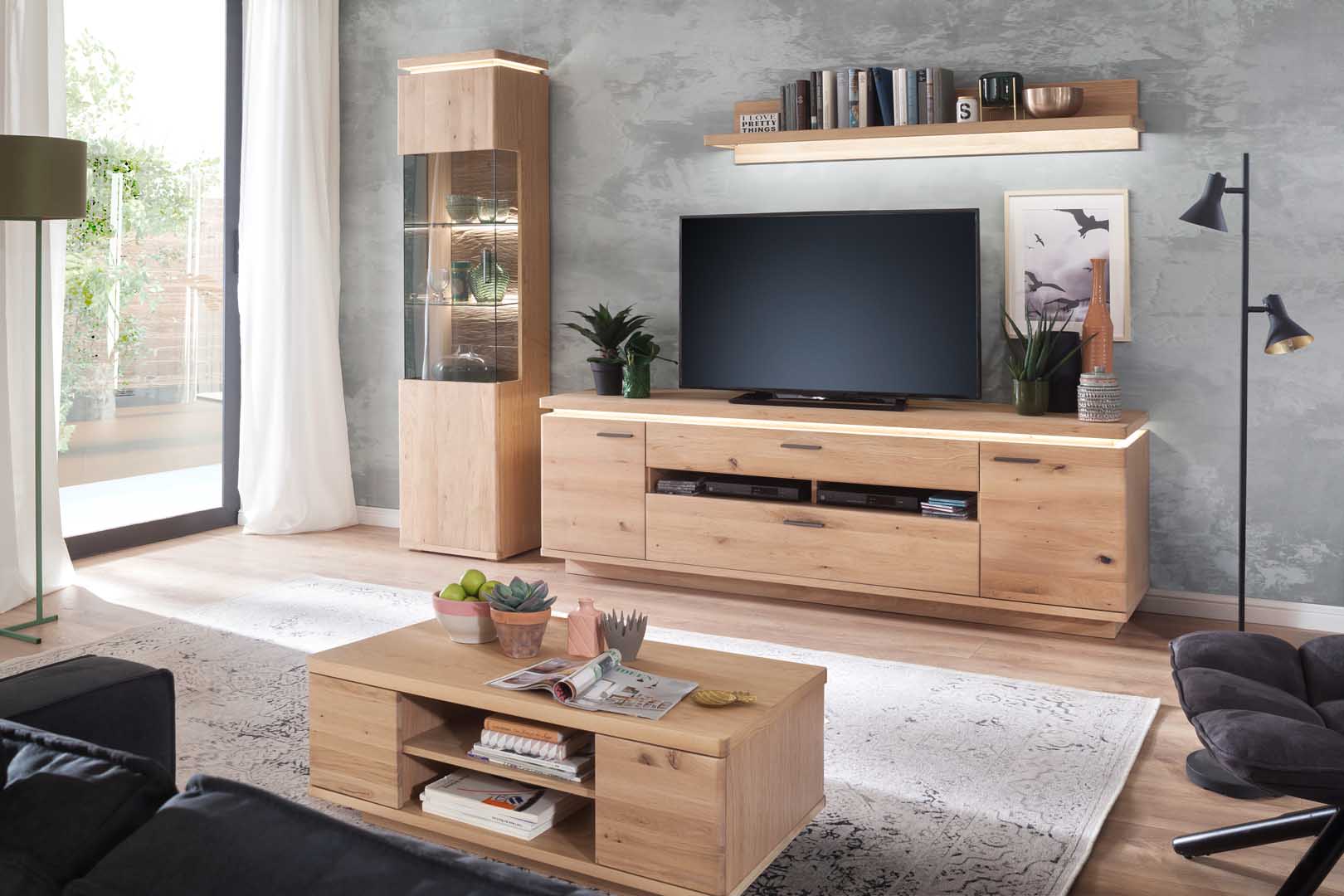 Das schöne 3-teilige Wohnwand-Set mit seinen natürlichen Fronten aus Balkeneiche bianco sorgt für eine moderne und gemütliche Atmosphäre in Ihrem Wohnzimmer.