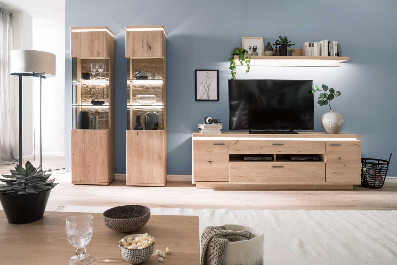 Die schicke Wohnwand setzt sich aus einem TV-Lowboard, einem Wandregal und einer traumhaften Vitrine zusammen. Die integrierte Beleuchtung sorgt für einen absoluten Blickfang in Ihrem Wohnzimmer.
