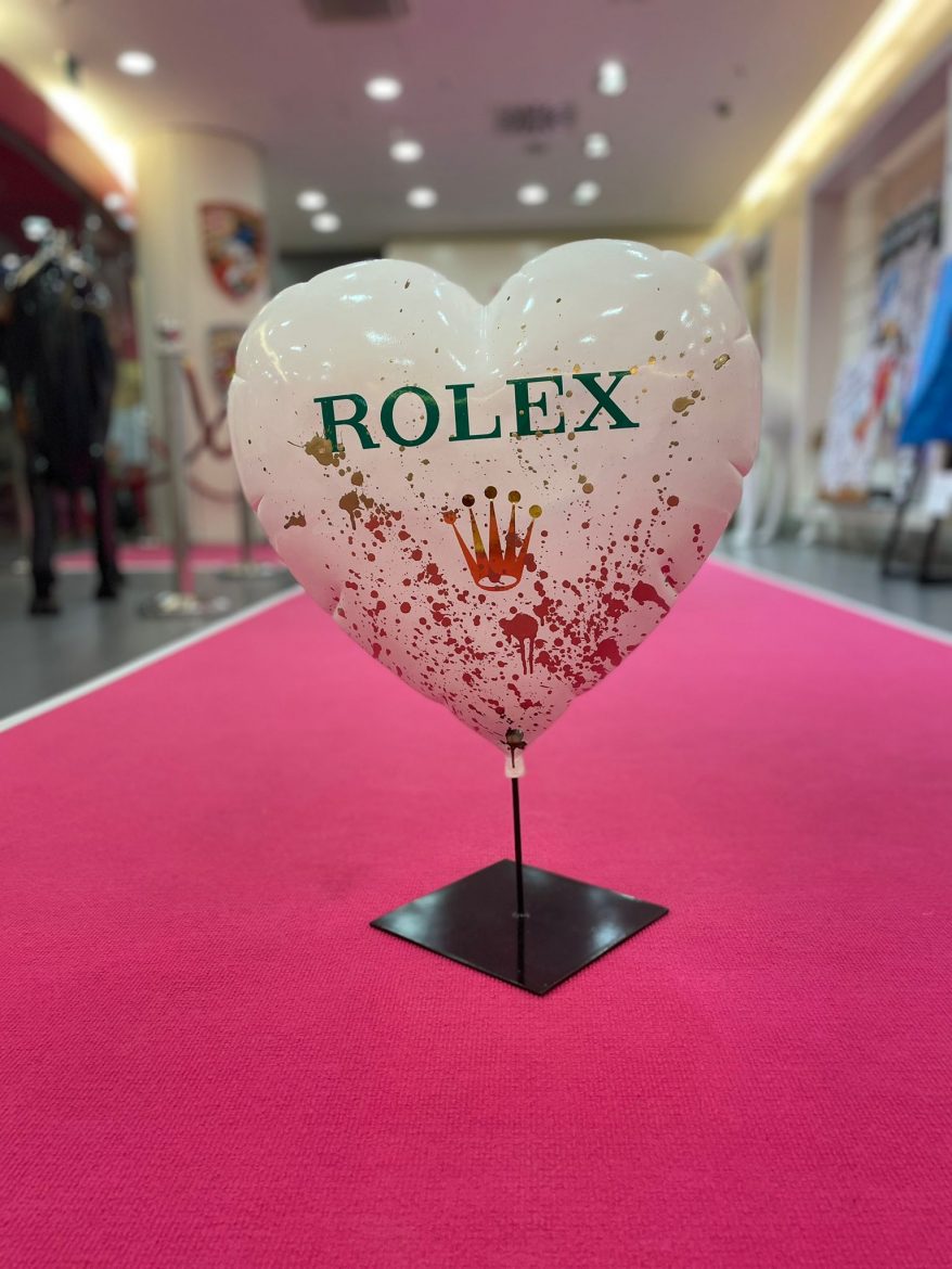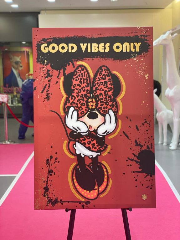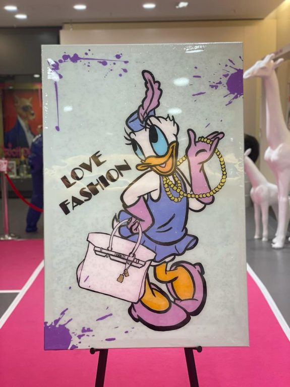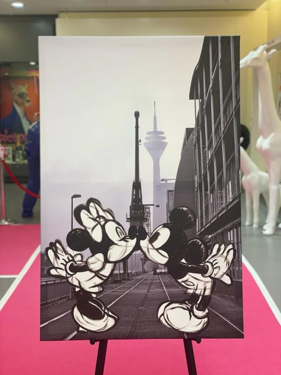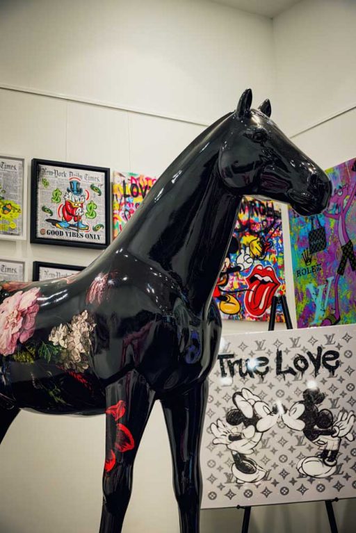Collagen in verschiedensten Techniken, Bilder auf Leinwand oder Metall von Disney-Comic – Figuren kombiniert mit Lifestyle-Elementen & Marken-Logos leuchten in großen Rahmen. Im hellen Raum platziert sind glänzende Skulpturen – ein goldener Mops, ein lebensgroßes Pferd, eine pinke Giraffe, Bären &King Kong. Designobjekte aus dem Luxus-Segment – vom Zucker – herz mit Luxus-Label-Print bis zum Champagner Magnum – runden die bunte Welt der mit Harz, Acryl &Glitter veredelten Einzel-Werke ab. Die Düsseldorferin Jessica Walter, aka Babedesign, hat hier ein Unikat-Universum geschaffen, in dem jeder sein individuelles Lieblingsstück findet.