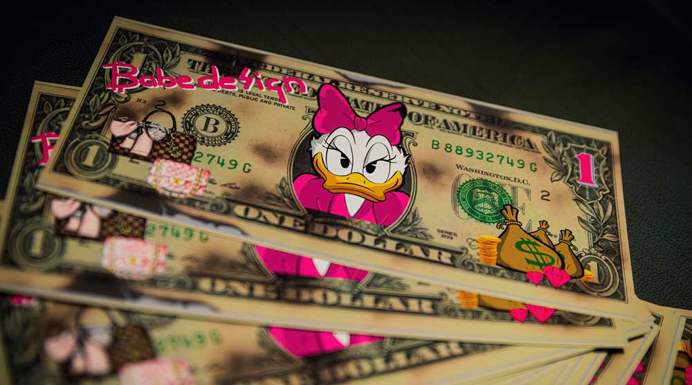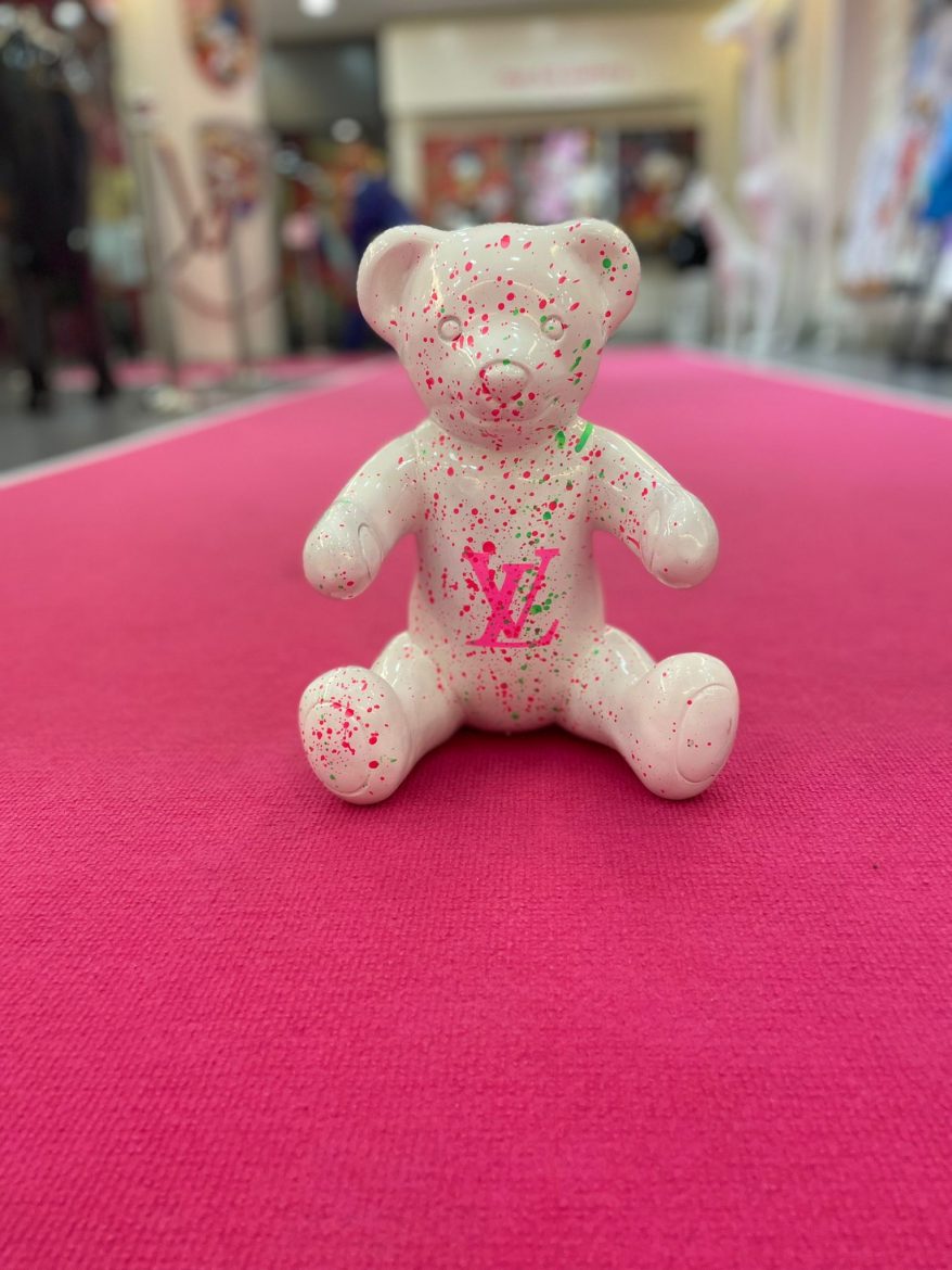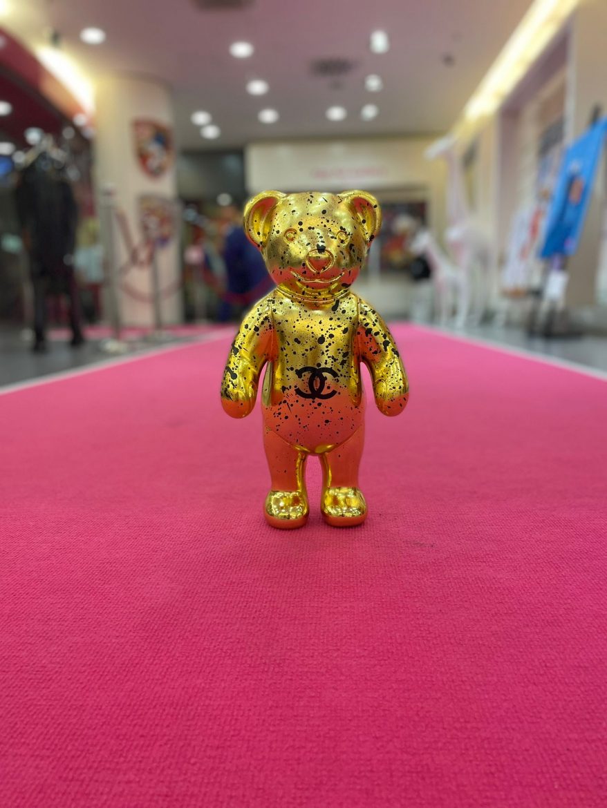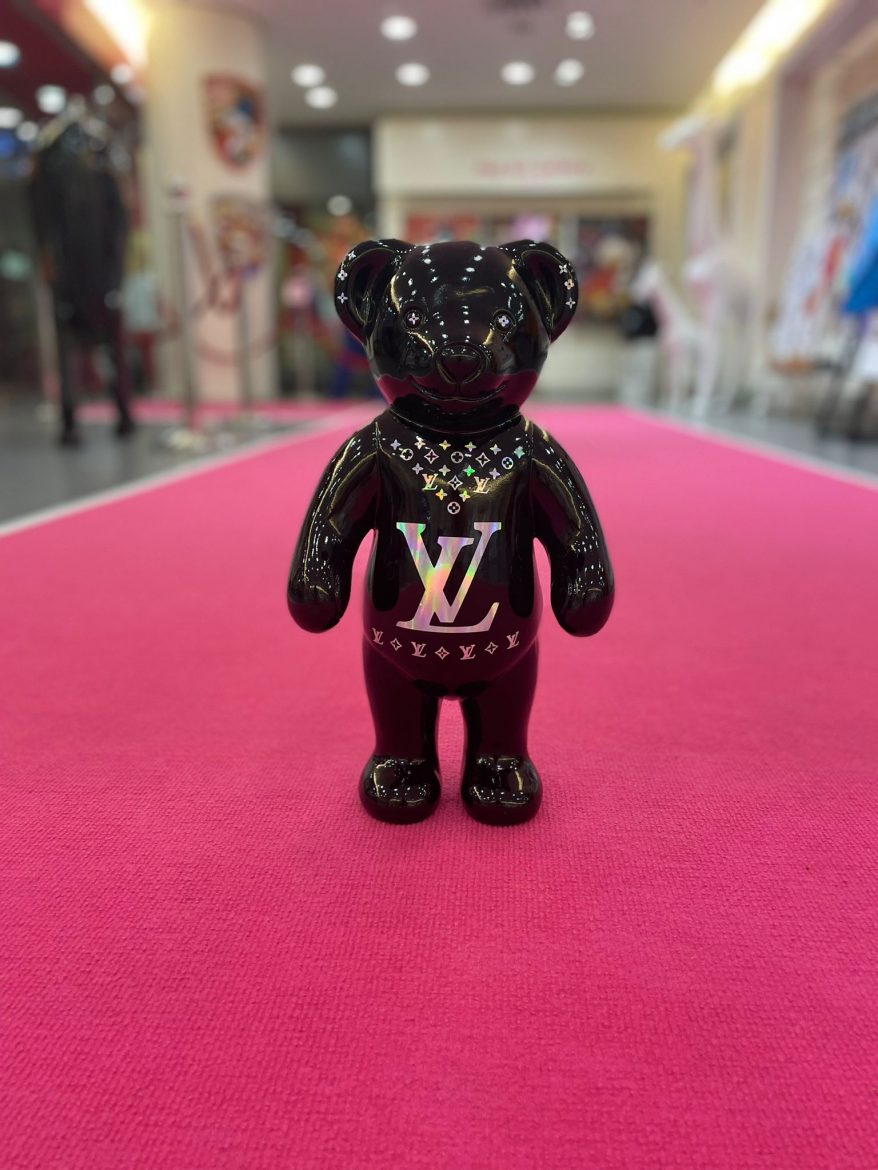Collagen in verschiedensten Techniken, Bilder auf Leinwand oder Metall von Disney-Comic – Figuren kombiniert mit Lifestyle-Elementen & Marken-Logos leuchten in großen Rahmen. Im hellen Raum platziert sind glänzende Skulpturen – ein goldener Mops, ein lebensgroßes Pferd, eine pinke Giraffe, Bären &King Kong. Designobjekte aus dem Luxus-Segment – vom Zucker – herz mit Luxus-Label-Print bis zum Champagner Magnum – runden die bunte Welt der mit Harz, Acryl &Glitter veredelten Einzel-Werke ab. Die Düsseldorferin Jessica Walter, aka Babedesign, hat hier ein Unikat-Universum geschaffen, in dem jeder sein individuelles Lieblingsstück findet.