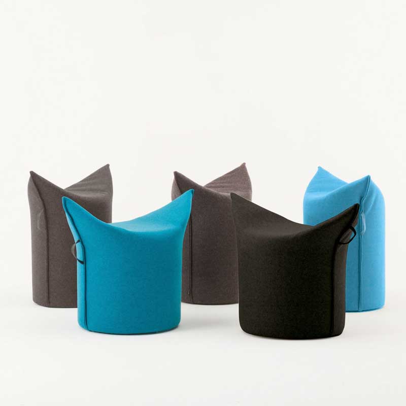 »Jeder Mensch braucht einen Zipfel!« ruft Werther, die Möbelmanufaktur im Ravensberger Hügelland am Nordrand des Teutoburger Waldes. Mit seinen angenehm gewalkten Bezügen aus Wollmischgewebe und einem nahezu unverwüstlichen Innenleben gibt sich der hohe Pouf überaus sympathisch und vielseitig. Denn er ist sehr leicht, lässt sich daher immer ganz einfach an eine andere Stelle rücken – durch den angesetzten Ledergriff selbst von kleinen Kindern. Entweder man sitzt zwischen seinen Zipfelchen oder rittlings, sogar selbst in seiner kleineren, aber breiteren Variante auch am Esstisch. Oder der von Jan Armgardt für Werther entworfene Hocker gesellt sich als Pouf zu Sofa und Sessel und dient somit dem gemütlichen Ablegen der Beine bzw. Füße.